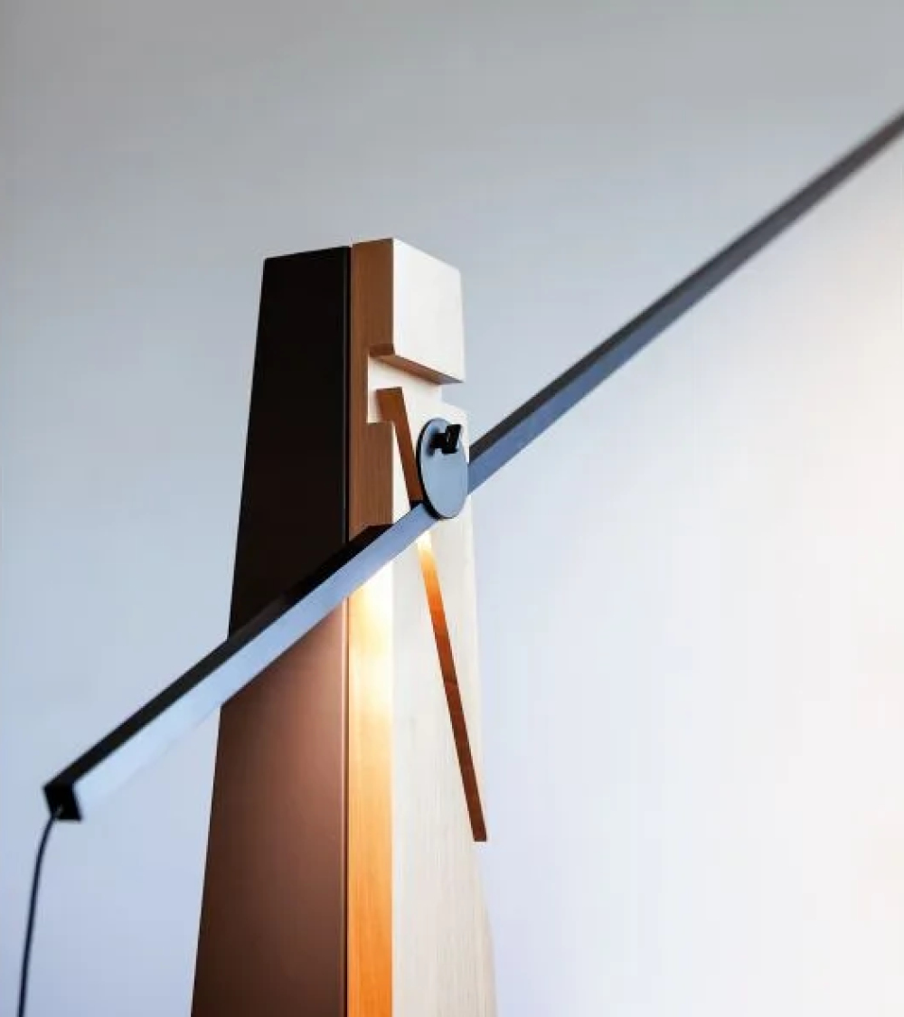 Floor lamp with double LED light sources. Solid oak or walnut base and arm in black anodized aluminum. Three carves on the top of the trunk allow to place the arm in three different angles giving the lamp a personal touch. The dimmable LED sources are along the arm and on the base back, creating both indirect and direct lighting.