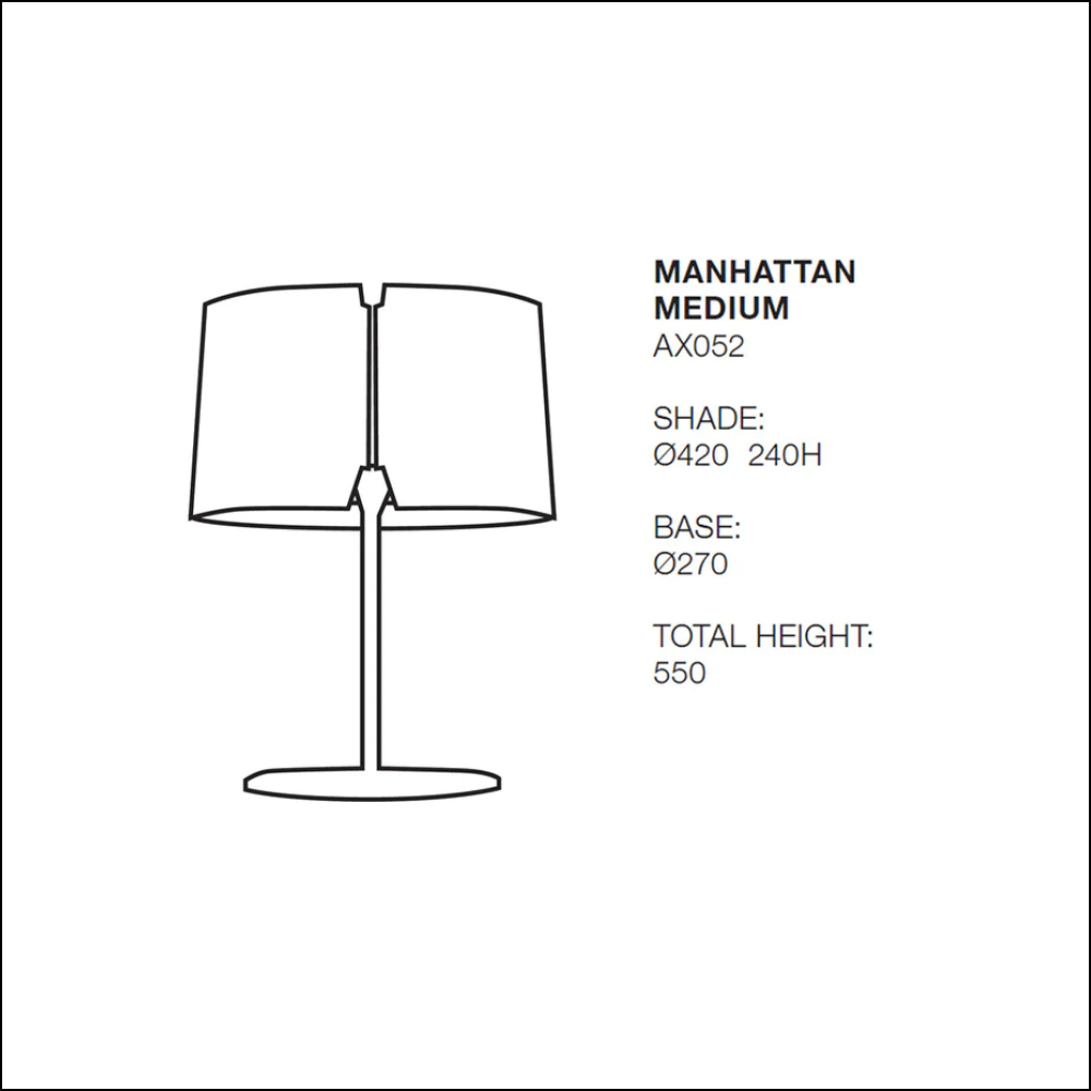 The Manhattan Round Table Lamp is composed of a painted metal base in a white finish with a shade, white outer options and white interior. Features 7 feet of cord and on/off switch.