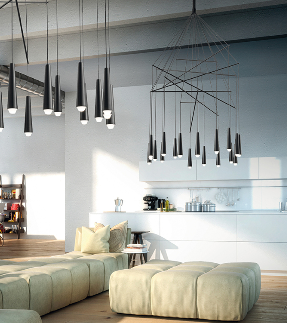 The various linear or circular pendant versions allow different degrees of customization and elaboration of the frame: simple and minimalist or complex and eccentric thanks to the overlapping planes at asymmetric heights. The LED sources are enclosed inside of conical metallic elements , available also with satin blown glass diffuser, further enriching the collection.