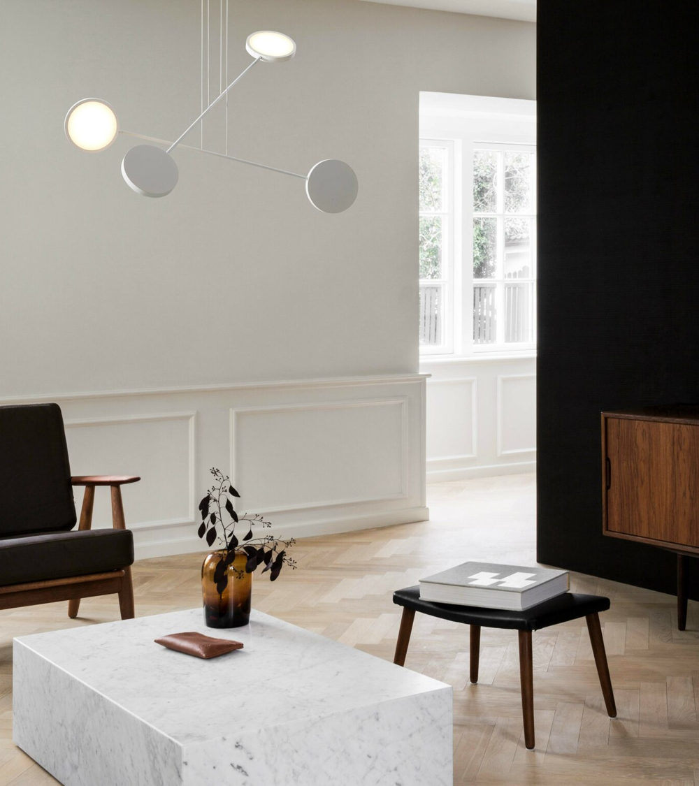The Mobi 2 Suspension from tossB draws one’s attention across the room with a sweeping design and elegant pair of rotating lamp heads. Creator Glen Marys brings to the piece a multi-faceted design background. The luminaire’s sweeping crossbar adds a neat line overhead that can be combined with a similar luminaire for a dynamic display. A circular lamp head on each end of the crossbar stands out with a metal backing on one side and a diffuser lens on the other. These lamp heads rotate to create a dynamic light display. The glare-free light exits with a clean, relaxed quality.
